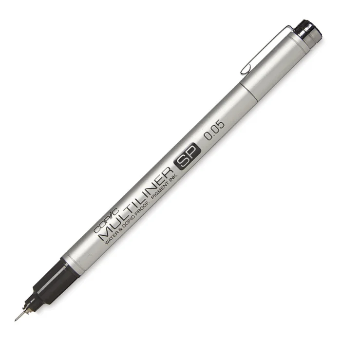 A single 0,05mm Copic SP Refillable Multiliner is shown diagonally across the center of the frame. The liners lid is off the nib and placed at the back of the liner, so you can see the size of the nib. The liner has a metallic silver barrel with the Copic Logo and nib size printed on the barrel. On a white background.