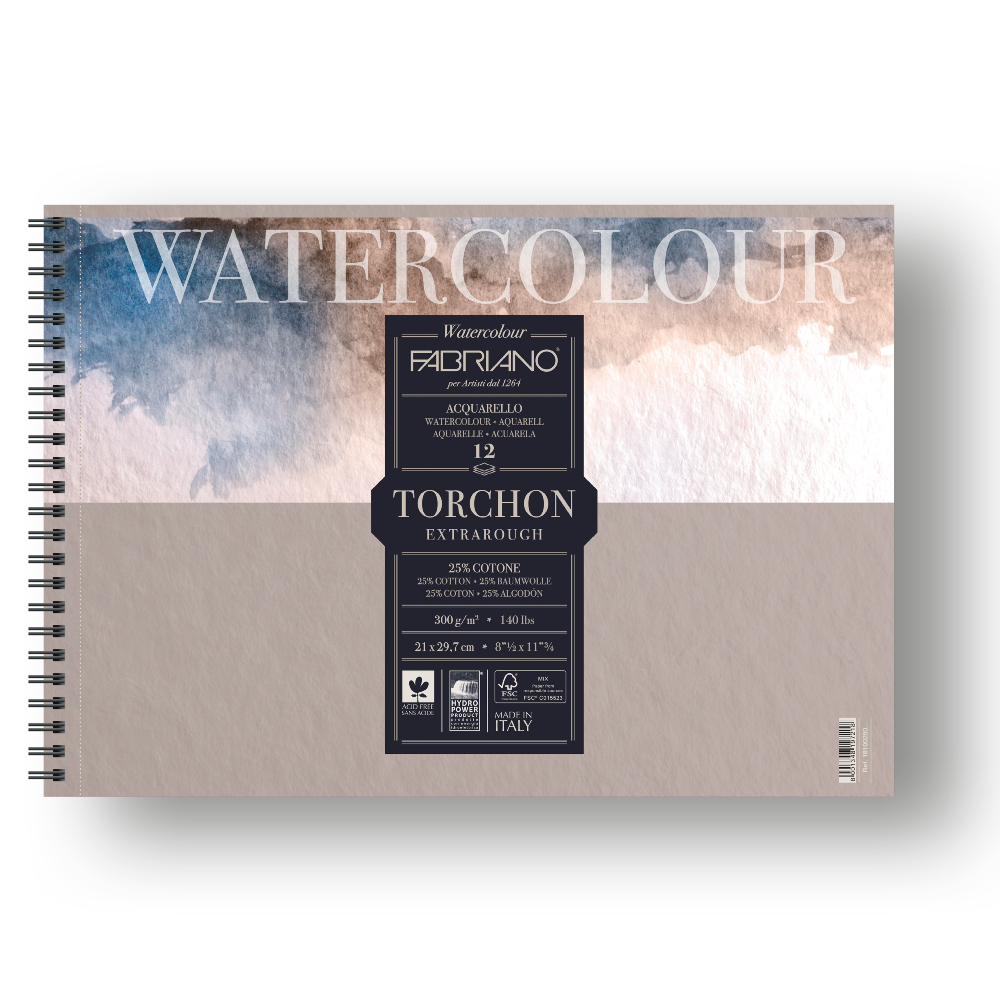 Fabriano Watercolour Studio Torchon Pads are the perfect choice for students, beginners or heavy users. This extra rough paper is made with a valuable mixture of lignin free cotton and cellulose and Acid Free to guarantee inalterability over time. It comes in different sized spiral pads, all containing 12 sheets per pad. Did you know Fabriano Watercolour Spiral Torchon Pads are also ideal for Gouache, Ink, Acrylic and for drawing, making them a great multi purpose pad to keep in stock.