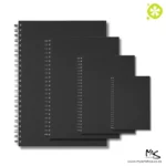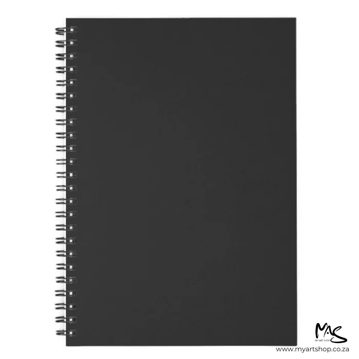 A single Prime Art Creative Journal is shown in the center of the frame. The cover is black and there is black wire binding down the left hand side of the journal. The book is portrait and is center of the frame on a white background.