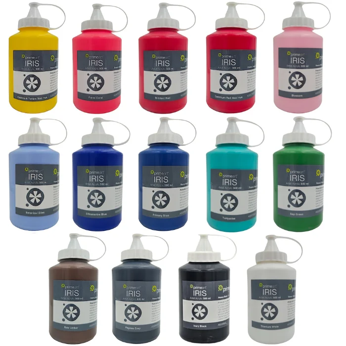 - The Iris Acrylic 500ml palette offers a range of 14 vibrant, lightfast colours (Cadmium Yellow Medium Hue / Floral Coral / Brilliant Red / Cadmium Red Medium Hue / Blossom / Botanical Bliss / Ultramarine Blue / Primary Blue / Turquoise / Sap Green / Raw Umber / Payne’s Grey / Ivory Black and Titanium White)