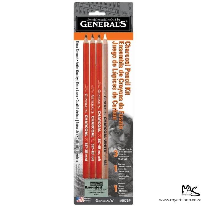 - The Charcoal Pencil and Eraser Kit includes three charcoal pencils (2B, 4B, 6B), 1 x charcoal white pencil, and a kneaded eraser.