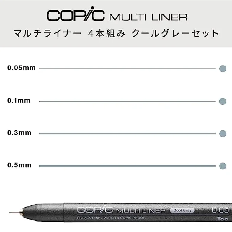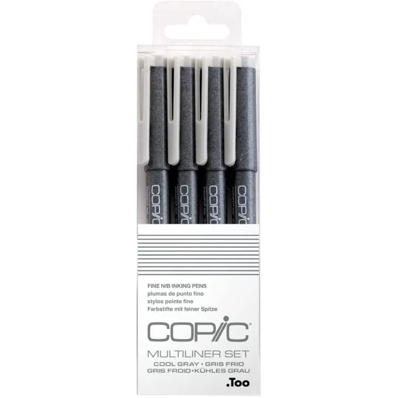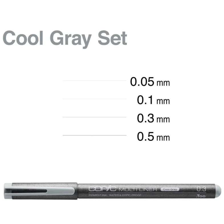 With their precise tips and high-quality inks, Copic Multiliners are a favourite tool of artists, illustrators, and architects for meeting the rigorous demands of their inking work. They allow for incredible detail and they utilize pigment-based ink that is bleedproof, water and alcohol resistant when dry, and ideal to use with Copic markers. The ink will not blur or fade, and is safe to use on printouts or photocopies. Its flow is consistent. Multiliners are the ideal choice when consistent line flow and precision counts. The Cool Grey Copic Multiliner Set includes sizes: 0.05, 0.1, 0.3, 0.5 mm.