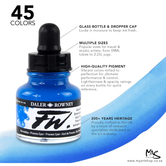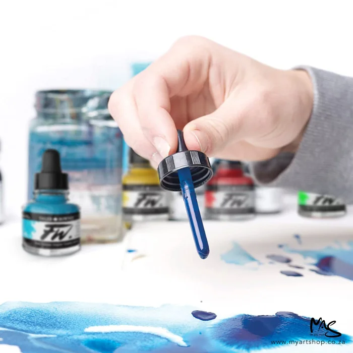 Daler Rowney FW Acrylic Inks are acrylic-based, pigmented, water-resistant artists’ inks with a high degree of lightfastness and intermixability