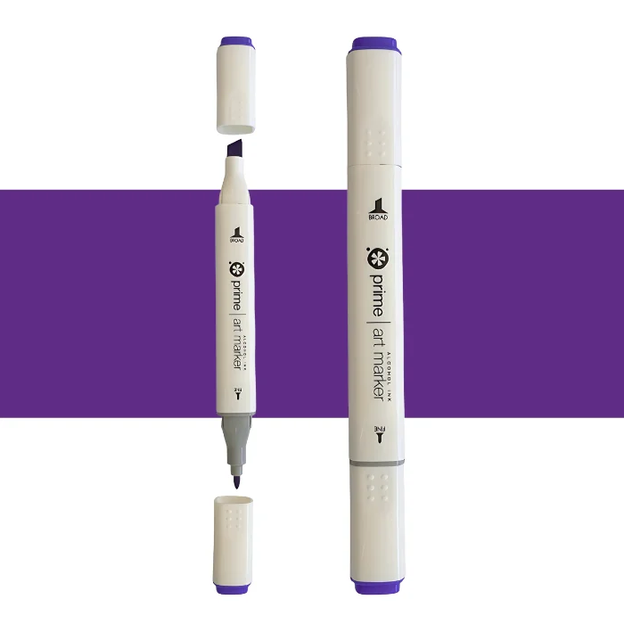 two prime art alcohol ink markers are standing upright in the center of the image. the one on the left has both caps off showing the two different types of nibs. the one on the right has both the caps on. they are cream coloured pens with black writing on them. they are sitting infront of a horizontal stripe of colour that shows what colour the marker is. on a white background