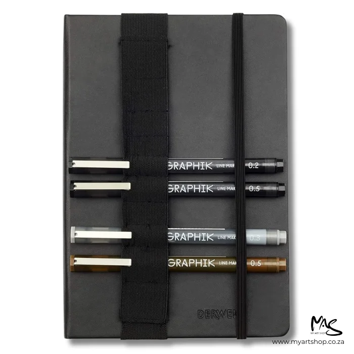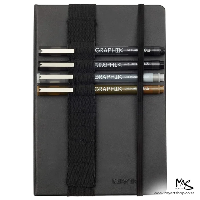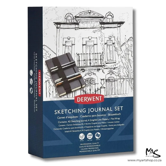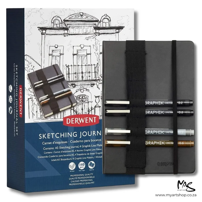 The Derwent A5 Sketching Journal Set serves as the ideal companion for sketching enthusiasts. This thoughtfully designed journal comes in a convenient A5 size, allowing you to effortlessly capture the world around you at a moment’s notice. It’s perfect for quick studies, thanks to its thread bound spine that opens completely flat, providing a level surface for your creative artwork. The set also includes a pen wrap and a set of lightfast water-based Graphik Line Makers in various rich and semi-permanent tones, such as Black, Graphite, and Sepia. This comprehensive set contains an A5 Sketching Journal with 80 sheets of 140gsm ivory-colored paper, an elastic closure, and the convenience of thread-bound pages that open flat for easy sketching and drawing.