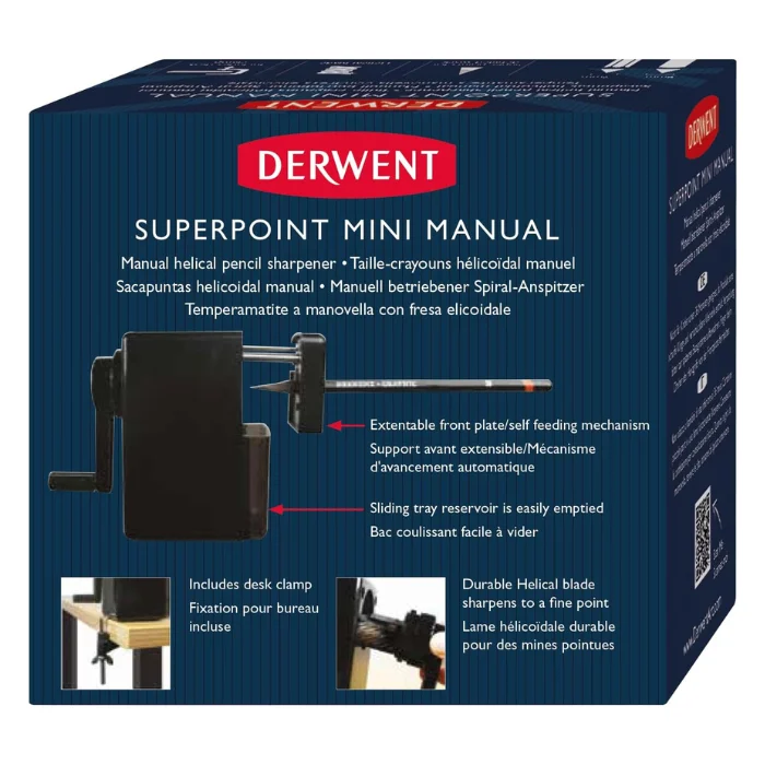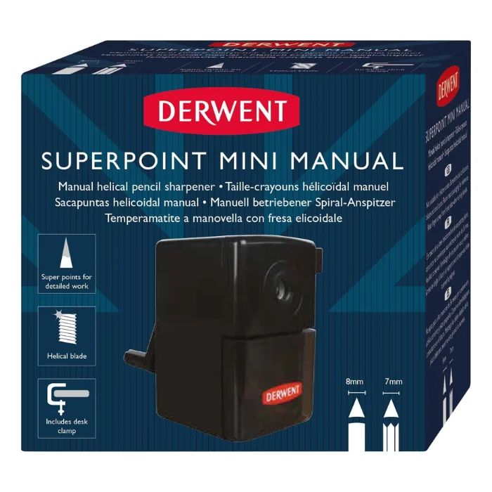 - The Derwent Super Point Mini Manual Sharpener comes with desk clamp.