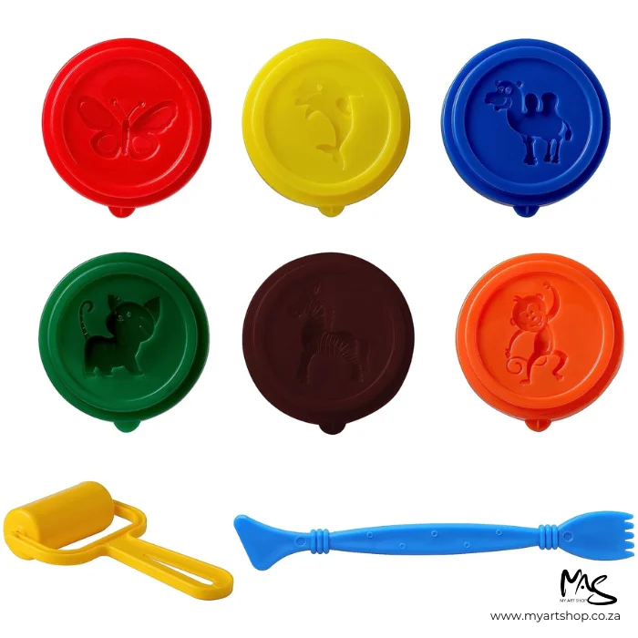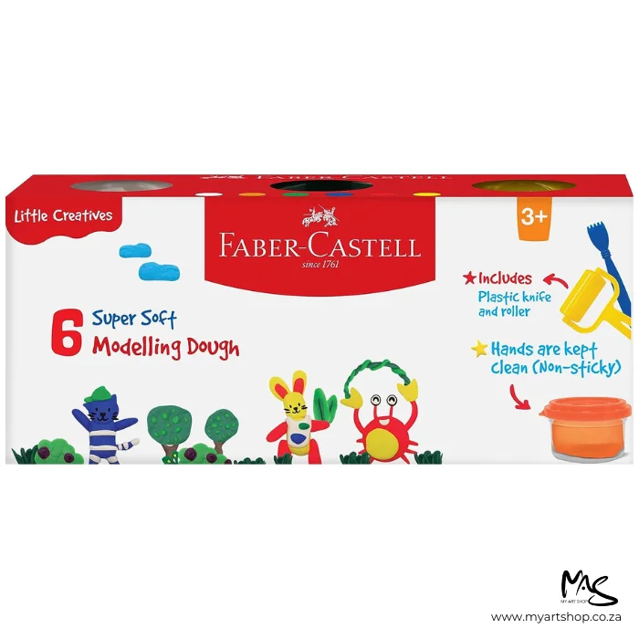 - Faber Castell Little Creatives Modelling Dough Set Regular Colours Contains 1 each of the following – Red, Blue, Green, Yellow, White and Orange + 1 x Roller and 1 x Cutter.