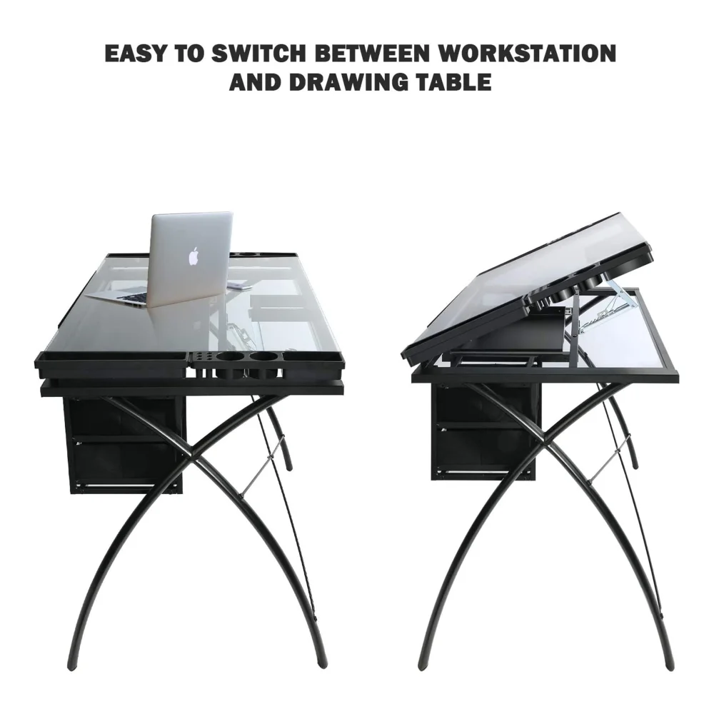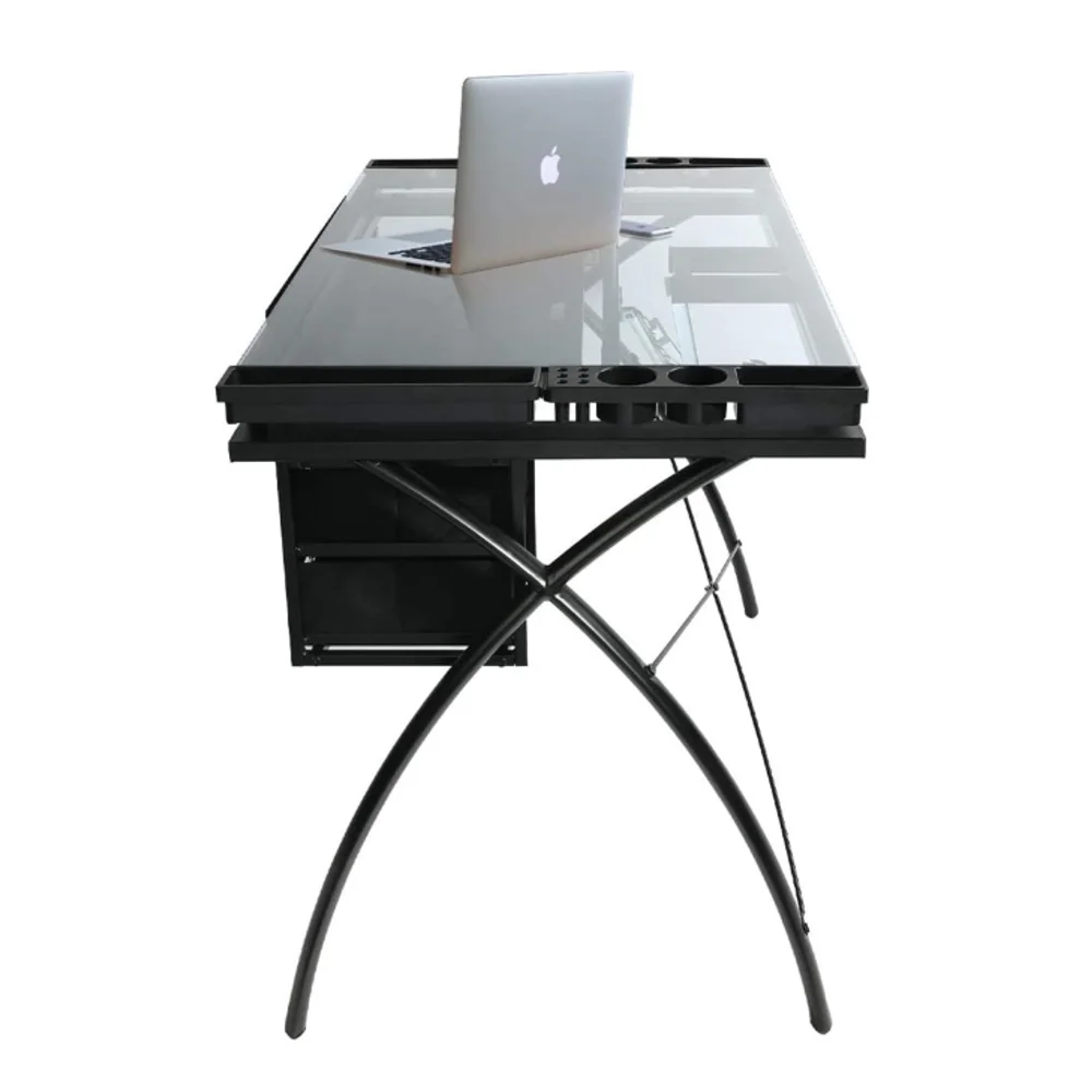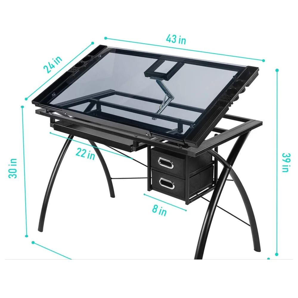 The Futura Art and Craft Work Station offers a sleek and contemporary design, crafted with a sturdy steel frame to ensure durability. Its tempered glass work surface provides a sophisticated touch and can be adjusted to multiple tilt angles, allowing artists to find their desired working position. With a large flat pull-out center drawer, storage becomes effortless, offering convenient space for keeping essential supplies within reach. Additionally, two smaller side drawers provide additional storage options for organizing smaller items. The work station also features plastic storage compartments on both sides of the work surface, further expanding the available storage area. Measuring 97cm x 61cm, the table work surface offers ample space for artistic endeavors. The Futura Art and Craft Work Station is elegantly designed with a black steel frame, adding a touch of modernity to any creative workspace.