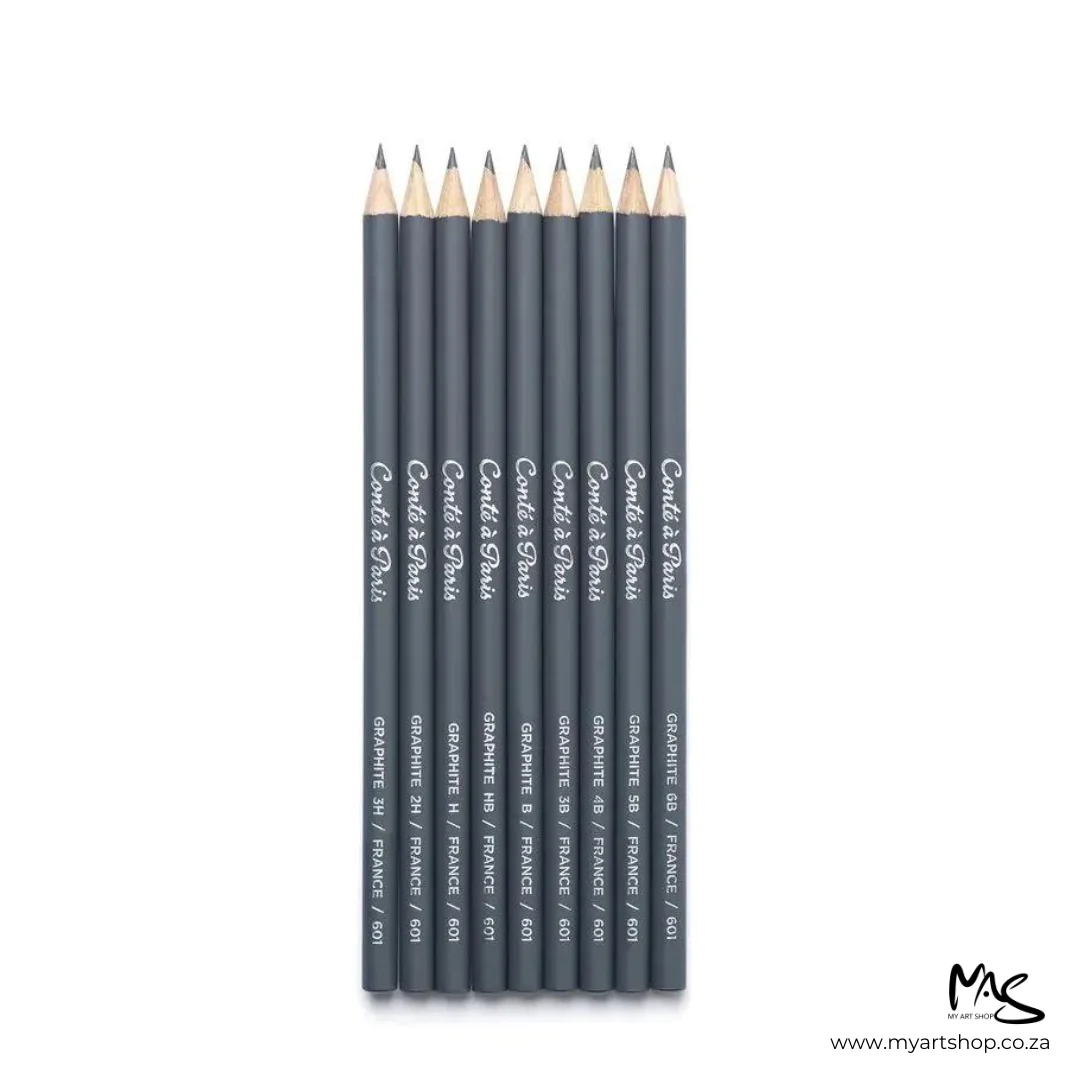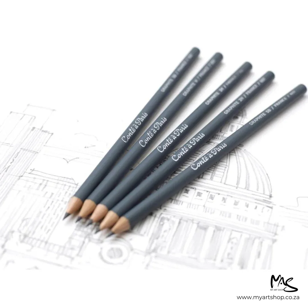 - Round-bodied coated wood case barrels embossed with the Conté à Paris brand and pencil details.