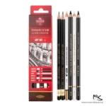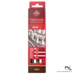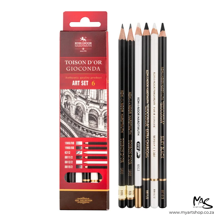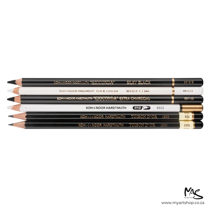 The Koh-I-Noor Gioconda Mini Art Set comprises six art pencils, featuring two KOH-I-NOOR HARDTMUTH 1900 graphite pencils in the hardness grades HB and 8B. To enhance artistic versatility, the set includes a black and white artificial charcoal pencil with medium hardness, mimicking the qualities of natural charcoal with premium quality pigments. Notably, the white charcoal pencil is designed for drawing on colored paper, offering unique creative possibilities. Adding to the collection is a SILKY BLACK medium gradation pencil, known for its extra black, oily trace. Completing the set is a practical pencil eraser, providing artists with a comprehensive range of tools for varied artistic expressions.