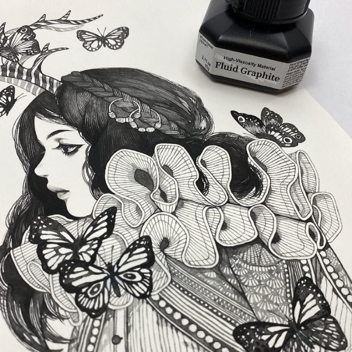 Artists can layer Fluid Graphite with other colours or mediums to achieve complex textures and tones. The non-erasable nature of the ink means that once applied, it will remain, allowing for careful layering without the risk of smudging previous work.