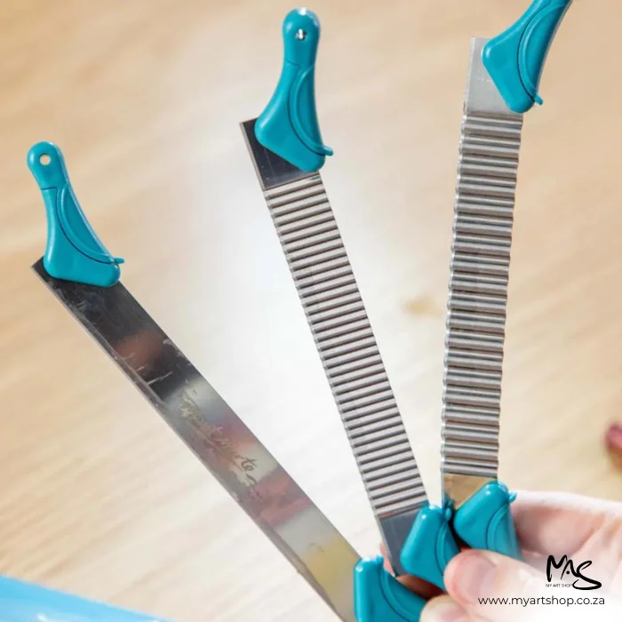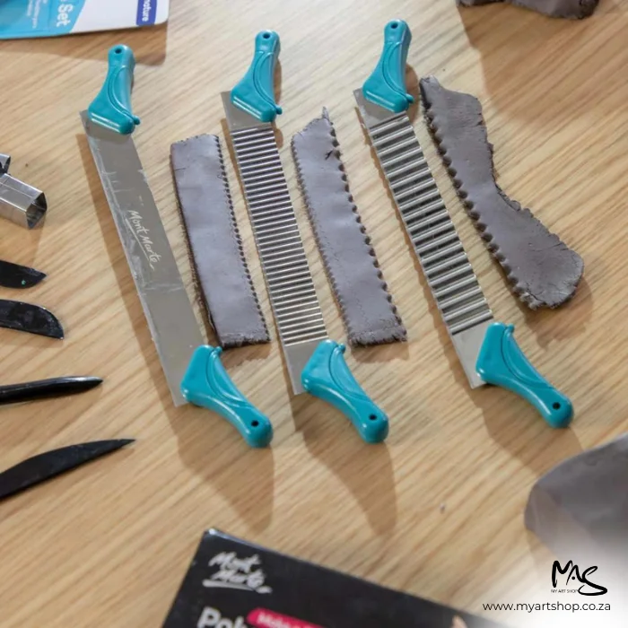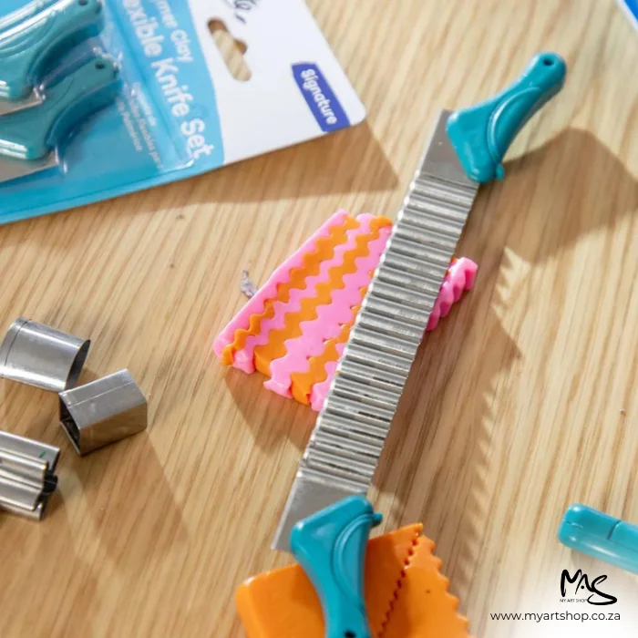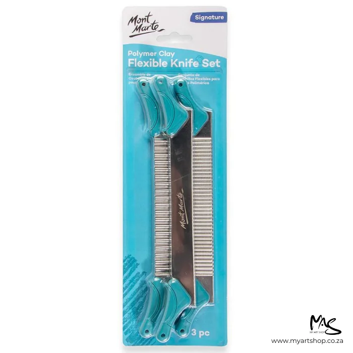 - The Mont Marte Signature Polymer Clay Flexible Knife Set includes 3 flexible blades for different types of cuts: straight, curved, and zigzag.