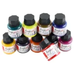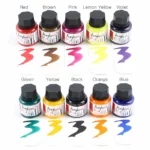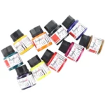 The inks are versatile and can be used for illustrations, airbrush applications, and writing on a variety of surfaces including paper, board, canvas, fabric, and wood. They are non-toxic and provide vibrant, permanent colours once dry.