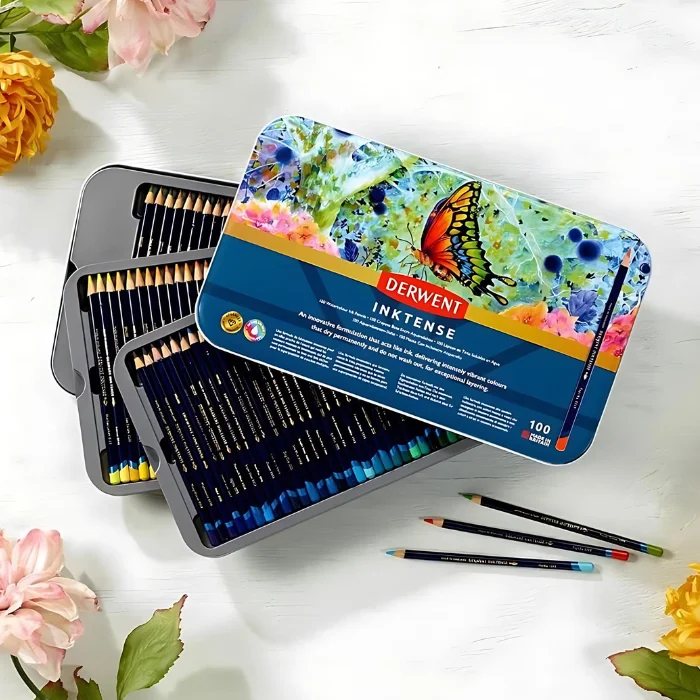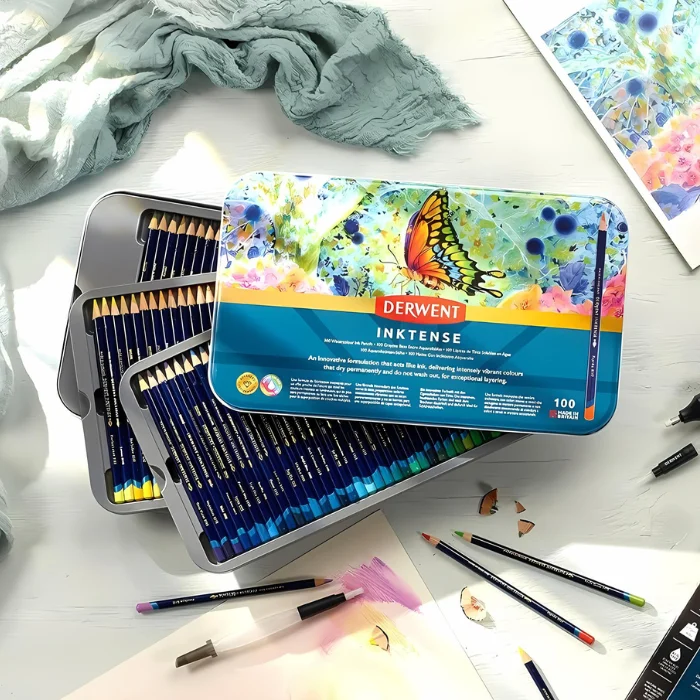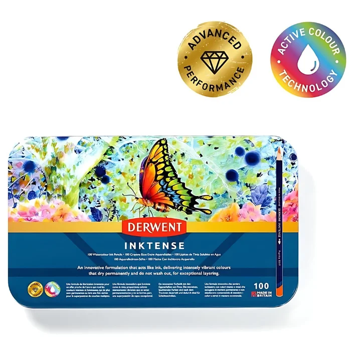 The Set of 100 Derwent Inktense Pencils consists of the following colours: