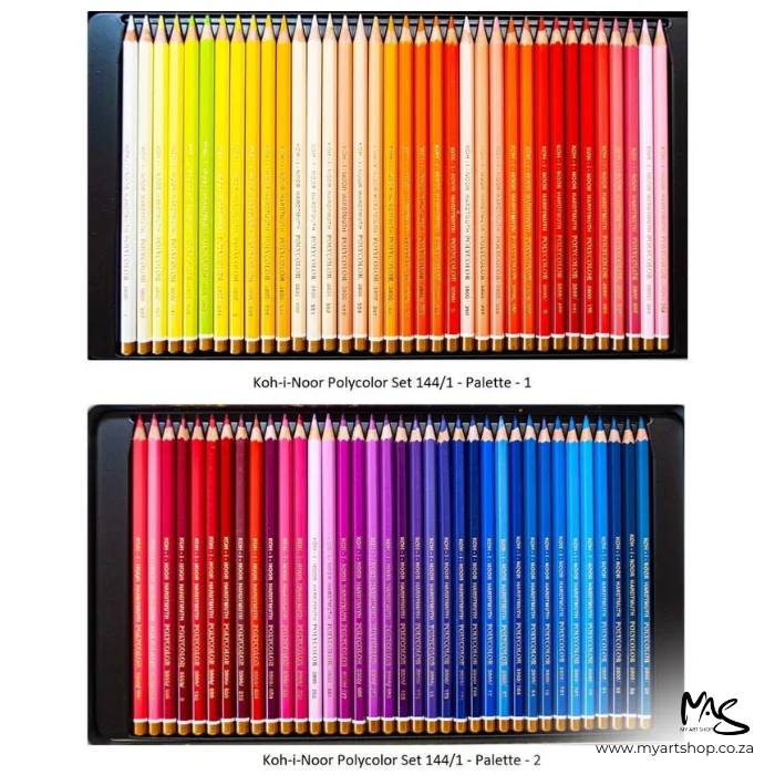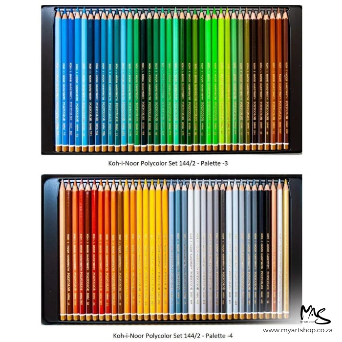 Set of 144 Koi-I-Noor Polycolor Pencils contains the following colours: Titanium White, Ivory Bone, Pollen Yellow, Banana Yellow, Lime Yellow, Chartreuse Yellow, Lemon Yellow, Chrome Yellow, Papaya Orange, Amber Orange, Tangerine Orange, Fair Portrait Gold, Portrait Fair, Portrait Light, Portrait Sand, Portrait Honey, Apricot Orange, Light Orange, Chromium Orange, Fire Orange, Persian Orange, Reddish Orange, Portrait Peach, Salmon Pink, Peach Orange, Portland Orange, Dark Salmon Orange, Vermilion Red, Light Scarlet Red, Scarlet Red, Pyrrole Red, Coral Red, Light Carmine Red, Antique Rose, Light Portrait Pink, Blush Pink, Punch Pink, Light French Pink, Burgundy Red, Bordeaux Red, Carmine Red, Current Red, Wine Red, Caput Mortuum, Dark Vermilion Red, Fig Purple, French Pink, Mexican Pink, Amaranth Pink, Orchid Purple, Lilac Violet, Byzantium Purple, Reddish Violet, Dark Reddish Violet, Dark Violet, Dark Lavender Violet, Lavender Violet, Bluish Violet, Windsor Violet, Midnight Blue, Cobalt Blue, Mountain Blue, Navy Blue, Dark Cobalt Blue, Sapphire Blue, Dark Azure Blue, Azure Blue, Cerulean Blue, Phthalo Blue, Permanent Blue, Indigo Blue, Prussian Blue, Dark Cerulean Blue, Light Blue, Sea Blue, Dark Ice Blue, Ice Blue, Dark Teal Blue, Teal Blue, Royal Teal, Teal Green, Bluish Green, Medium Turquoise, Persian Green, Jade Green, Deep Green, Dark Green, Emerald Green, Light Emerald Green, Light Jade Green, Pea Green, Avocado Green, Sap Green, Meadow Green, Grass Green, Light Green, Spring Green, Yellowish Green, Apple Green, Celadon Green, Light Olive Green, Dark Olive Green, Dark Earth Brown, Dark Brown, Burnt Umber, Natural Sienna, Hazelnut Brown, Cafe Noir Brown, Almond Brown, Light Brown, Sandstone Brown, Burnt Sienna, Medium Terracotta, Reddish Brown, Cinnamon Brown, Burnt Ochre, Brown Ochre, Raw Umber, Naples Yellow, Yellow Brown Ochre, Dark Gold Ochre, Gold Ochre, Yellow Ochre, Dark Yellow Ochre, Light Ochre, Light Bluish Grey, Slate Grey, Medium Grey, Warm Grey 1, Warm Grey 2, Warm Grey 3, Warm Grey 4, Warm Grey 5, Warm Grey 6, Warm Grey 7, Warm Grey 8, Cool Grey 1, Cool Grey 2, Cool Grey 3, Cool Grey 4, Cool Grey 5, Cool Grey 6, Cool Grey 7, Cool Grey 8, Cool Grey 9, Ivory Black, Standard Bronze, Standard Silver, Standard Gold, and a Colorless Blender.