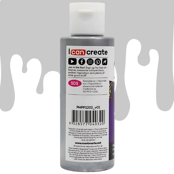 - Silver Mont Marte Pouring Acrylic Paint is available in a 120ml bottle.