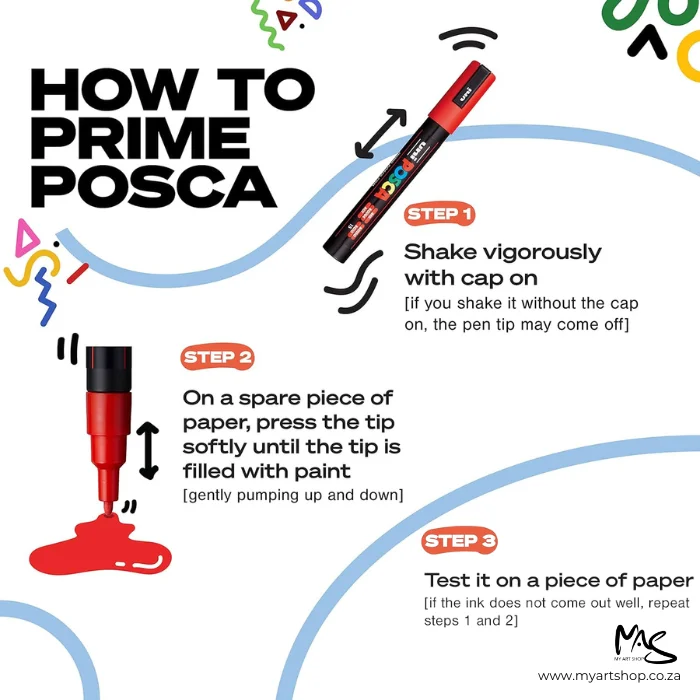 If the paint begins to flow less freely during use, shake the marker again, taking care to put the cap back on first to avoid paint splatter. Re-prime the tip, test it and o! you go again!