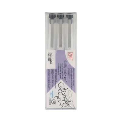 - This oblique set of the Zig Calligraphy Pen features 3 black pens with tip sizes 1mm, 2mm, and 3mm
